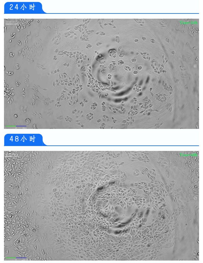 待細(xì)胞靜置穩(wěn)定后,運(yùn)行CELLImage全自動(dòng)活細(xì)胞成像儀,設(shè)置明場(chǎng)條件、優(yōu)化對(duì)焦,間隔時(shí)長(zhǎng)30min/次,計(jì)劃總周期為150次。