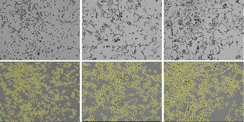 通過CELLImage Mini全自動活細(xì)胞成像儀觀察比較三種不同細(xì)胞系中細(xì)胞播種密度依賴性增殖的變化,并且用儀器自帶的Readcells軟件AI智能算法對其分析定量生成生長曲線,如上圖顯示儀器可以有效的識別三種不同形態(tài)的細(xì)胞并計(jì)算生長面積,了解細(xì)胞播種差異對細(xì)胞增殖的影響對于控制試驗(yàn)變異因素是很重要的。另外,觀察三種細(xì)胞的增殖曲線變化,可以發(fā)現(xiàn)293T細(xì)胞增殖呈現(xiàn)異常,追溯此前的培養(yǎng)過程可能是由于細(xì)胞經(jīng)過長時間饑餓處理導(dǎo)致其狀態(tài)受到影響,進(jìn)而影響其傳代后的正常增殖過程。