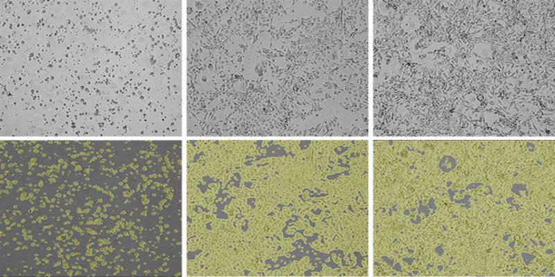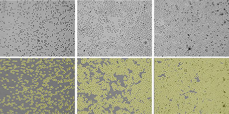 將293T細(xì)胞、HELA細(xì)胞、B16細(xì)胞分別以初始密度1K/2K/5K/10K/15K/20K接種至24孔板中,用CELLImage Mini全自動活細(xì)胞成像儀對24孔板持續(xù)明場96小時監(jiān)測,分別間隔2小時采集一次圖像,在終點(diǎn)試驗(yàn)前檢查生長情況。隨著時間的推移,活細(xì)胞成像設(shè)備可以用來準(zhǔn)確地、無標(biāo)記的記錄細(xì)胞的形態(tài)變化和增殖變化,如圖所示。